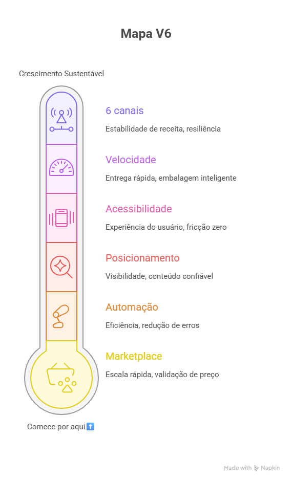 Implemente os fundamentos: loja virtual otimizada, presença nos marketplaces certos e SEO afiado. Em seguida, evolua com automações, marketing inteligente e análise de dados.